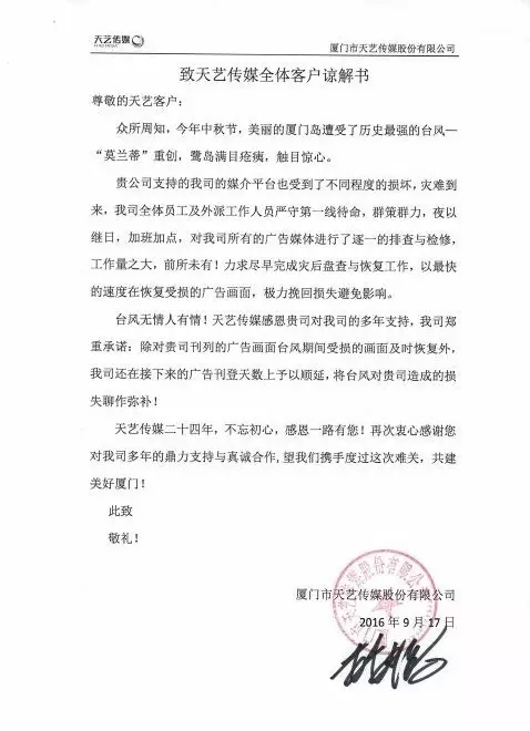 臺(tái)風(fēng)無(wú)情人有情!天藝傳媒感恩貴司對(duì)我司的多年支持,我司鄭重承諾:除對(duì)貴司刊列的廣告畫(huà)面臺(tái)風(fēng)期間受損的畫(huà)面及時(shí)恢復(fù)外,我司還在接下來(lái)的廣告刊登天數(shù)上予以順延,將臺(tái)風(fēng)對(duì)貴司造成的損失聊作彌補(bǔ)!